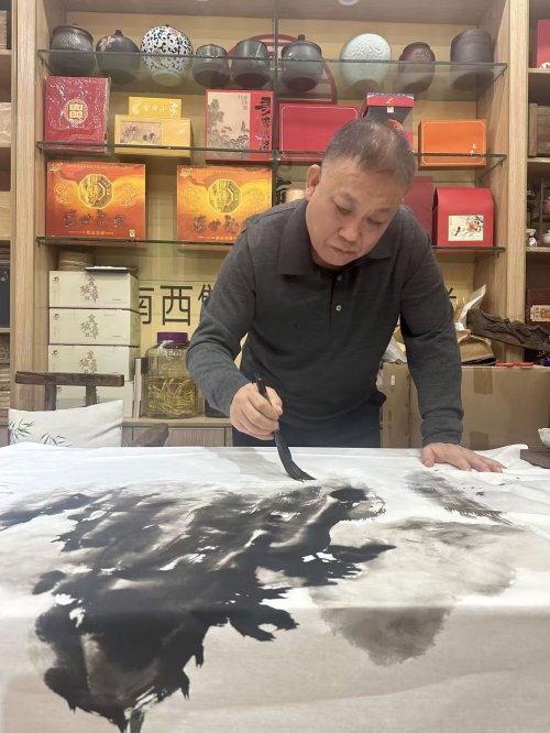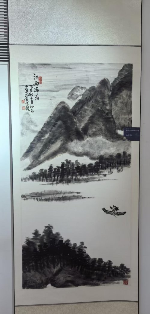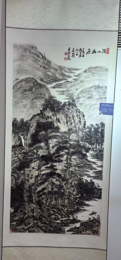 圆明园的一砖一瓦都藏着故事,这里的沧桑与厚重,是艺术创作最珍贵的养分。郭晋山在采风现场表示。他专注于观察遗址的肌理质感与光影变化,将历史的深沉与自然的生机融入创作构思,其创作理念与活动“以学术高度激活遗产生命力”的宗旨高度契合。郭晋山老师参展的两幅山水画作品《深山幽居》与《江雨渔翁》备受瞩目。《深山幽居》以全景式构图展现深山静谧,苍松挺拔、山石浑厚、云雾空灵,笔墨苍劲间尽显传统山水“可居可游”的审美追求。《江雨渔翁》以简淡空灵笔墨语言,融合江南烟雨诗意与渔翁悠然心境,体现画家对“天人合一”境界的追求,展现其在传统水墨语言中融入现代审美意趣的创作风格。