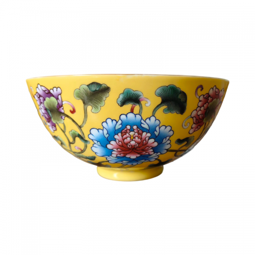 色彩运用:纹饰色彩丰富多变,红的热烈、粉的娇柔、蓝的沉静、紫的典雅,再配以深绿的叶片与婉转的枝蔓,在明黄地的衬托下显得格外艳丽夺目。这种色彩搭配既符合宫廷用器的华贵风格,也体现了清代珐琅彩工艺的高超水准。